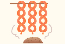 ねじったウインナーを竿に通して吊るし、乾燥後に広葉樹のチップでいぶしてスモークする。 |