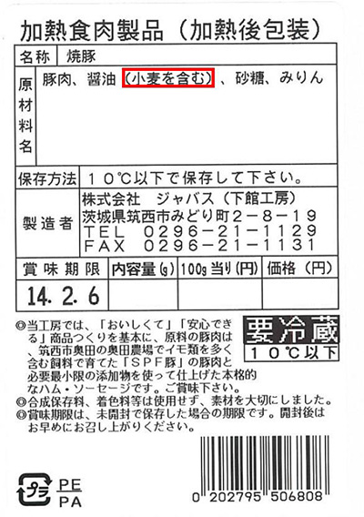 この度、弊社商品「下館工房 焼豚」におきまして、誤って別商品の一括表示ラベルを貼付し出荷したことが判明いたしました。「焼豚」には「小麦」が含まれておりますが、誤ったラベルには「小麦」のアレルゲン情報が記載されておりません。